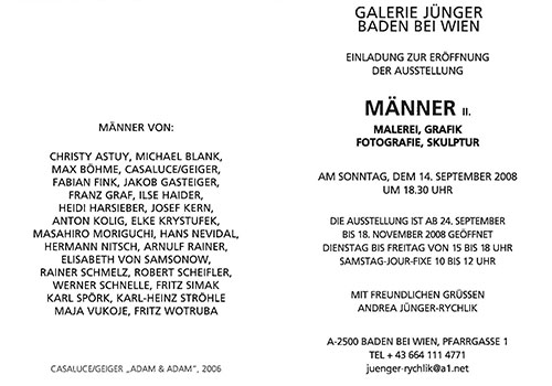 Christy Astuy * Michael Blank * Max Böhme * CASALUCE/GEIGER * Fabian Fink * Jakob Gasteiger * Franz Graf * Ilse Haider * Heidi Harsieber * Josef Kern * Anton Kolig * Elke Krysufek * Masahiro Moriguchi * Hans Nevidal * Hermann Nitsch * Arnulf Rainer * Elisabeth von Samsonow * Rainer Schmelz * Robert Scheifler * Werner Schnelle * Fritz Simak * Karl Spörk * Karl-Heinz Ströhle * Maja Vukoje * Fritz Wotruba - MÄNNER II