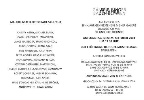 Christy Astuy* Michael Blank* CASALUCE/GEIGER* Fabian Fink* Jakob Gasteiger* Bruno Gironcoli* Rudolf Goessl* Franz Graf* Uwe Hauenfels* Josef Kern* Peter Kogler* Hans Kupelwieser* Hans Nevidal* Hermann Nitsch* Oswald Oberhuber* Martin Pohl* Hubert Roithner* Elisabeth von Samsonow* Robert Scheifler* Hubert Schmalix* Fritz Simak* Karl Spörk* Hans Staudacher* Karl-Heinz Ströhle* Anton Wichtl* Erwin Wurm - CENTRO - 10 Jahre Galerie Jünger