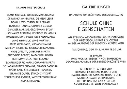 Michael Blank * Malgorzata Bujnicka * Annemarie Cerwenka * Leslie de Melo * Wolfgang Dokulil * Fabian Fink * Hannes Fladerer * Gerald Grabner * Markus Gradner * Sylvia Grossmann * Bertram Hasenauer * Johannes Höfinger * Uwe Hauenfels * Annamaria Innerhofer * Jang Hyun Suk * Martina Jung * Wolfgang Krebs * Hanne Kröncke * Ingeborg Merenyi * Masahiro Moriguchi * Danuta Nycz * Martin Osterider * Robert Puczynski * Jürgen Ramacher * Ulla Reithmayr * Roland Rust * Richard Schipflinger * Martin Schrampf * Susanne Sehn-Baumhakel * Barbora Slivova * Karl Spörk * Franziska Stiegholzer * Oliver Strametz * Kurt Straznicky * Evelina Tcherecheva * Franz Wienerberger * Christiane Zima - Eröffnung "SCHULE OHNE EIGENTSCHAFTEN"